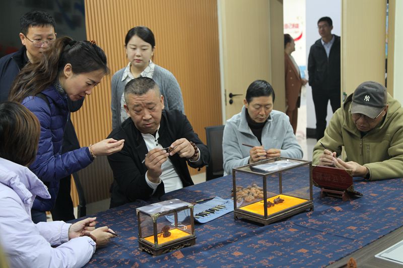 潍坊奎文区健康街社区的非遗传承人张永刚向大家展示核雕作品。新华网发(潍坊文明网供图)