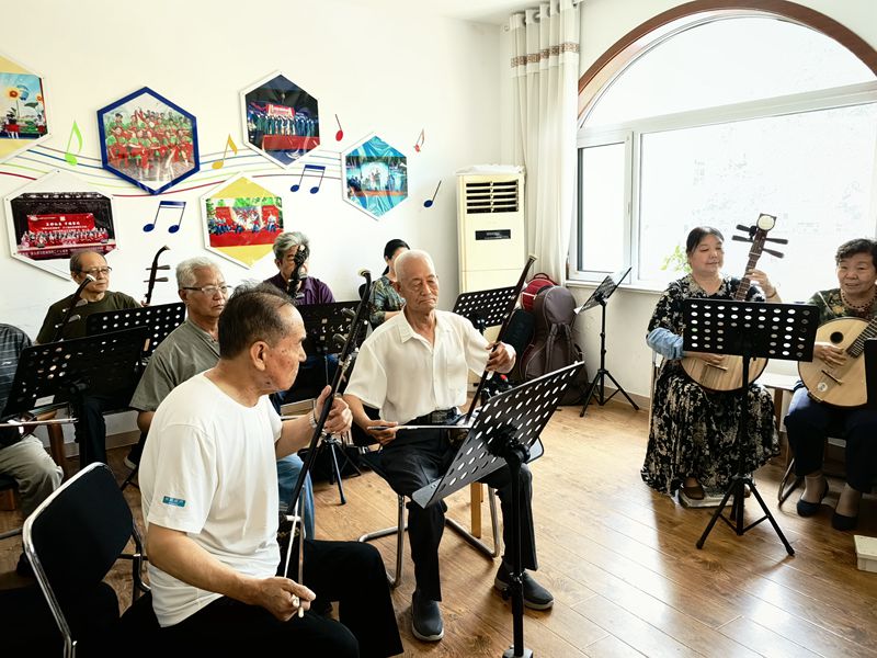 潍坊市奎文区文化路社区居民正在进行戏曲演奏练习。新华网发(潍坊文明网供图)