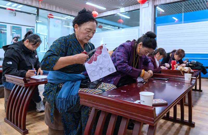 10月21日,青海省西宁市城西区文亭巷社区居民在新时代文明实践站参加剪纸培训。新华网记者 钟奕 摄