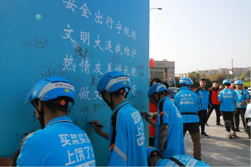 今年10月“文明大连 有你真好——争做文明好小哥”活动启动仪式上,骑手代表签名承诺文明出行。(图片来源:大连市文明办)