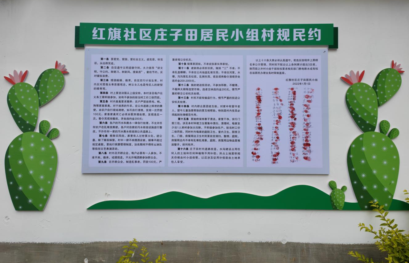 村子美了,怎么美得长久又是一大难点。随着越来越多人到庄子田采摘仙人掌果,庄子田又把大家的心聚到了一起。为保持村内干净洁美,村民主动提出重新修订完善村规民约,把“道路定时扫、牛粪及时铲、庭院每日清”纳入村规民约范围,以签字按手印认可方式引导村民自觉遵守,党员干部带头执行,村规民约从“要我遵守”转变为“我要遵守”,昔日“脏乱污臭村”变成了今日的“洁净绿美村”。同时村里还组建了爱心服务队,把村内妇女集中起来,根据村内需求,不定期开展环境大扫除、困难帮扶、政策宣传等志愿服务活动,得到群众广泛认可,得到街道、社区点赞。如今的庄子田干净整洁、推窗见景、满眼皆绿、焕然一新。
