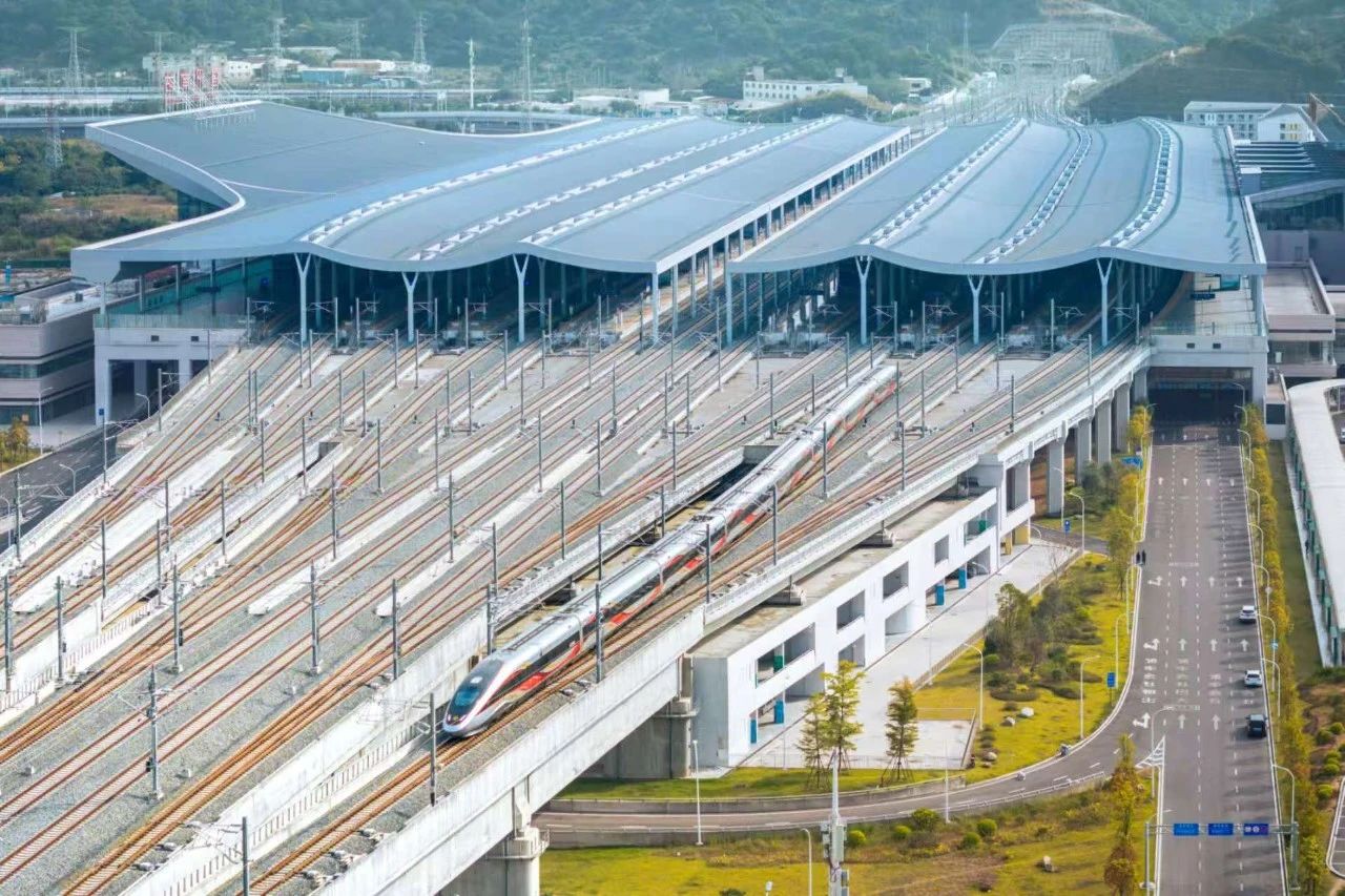 一列复兴号动车组列车驶出福州南站,载着游子驶向家的方向。