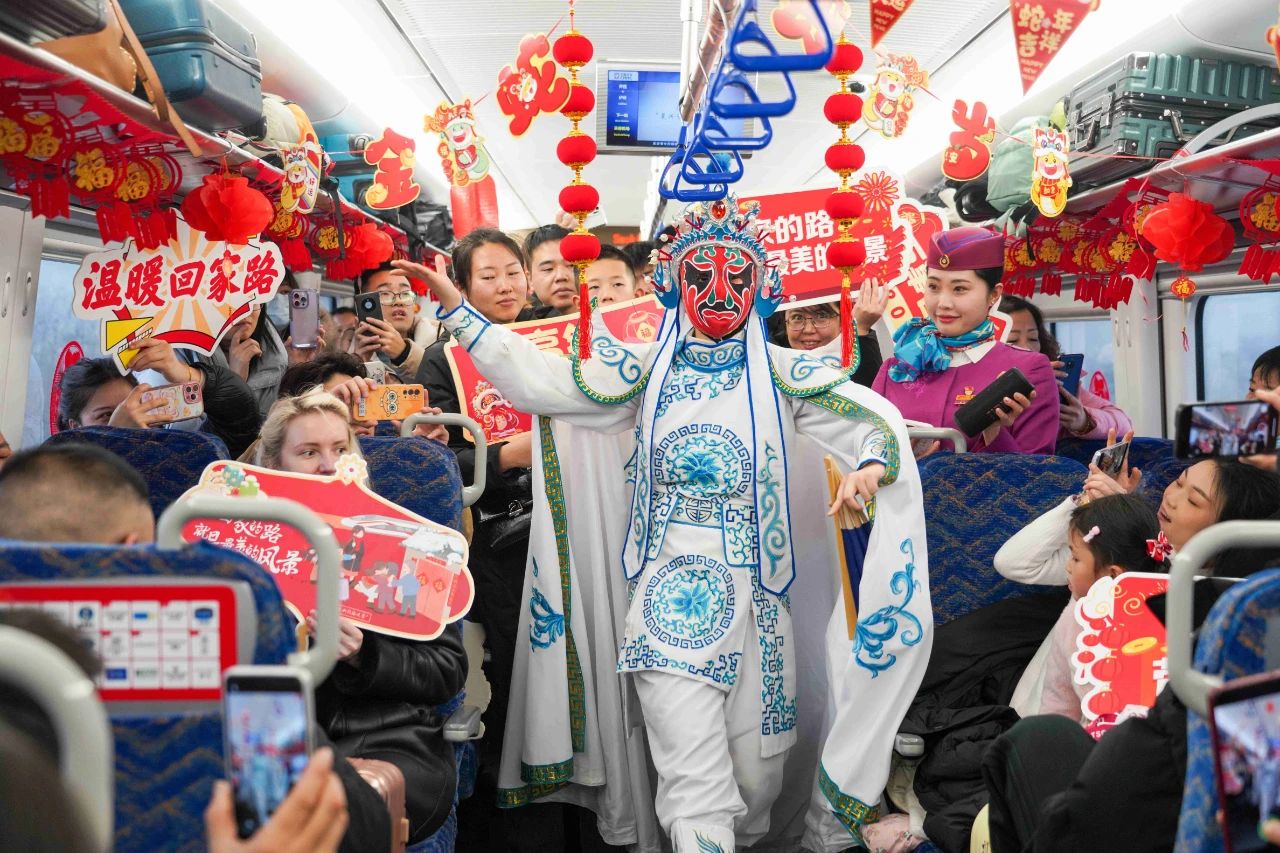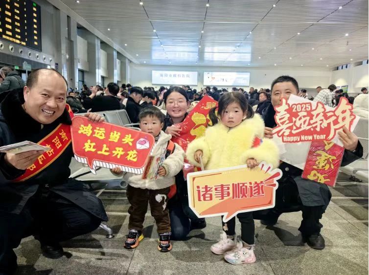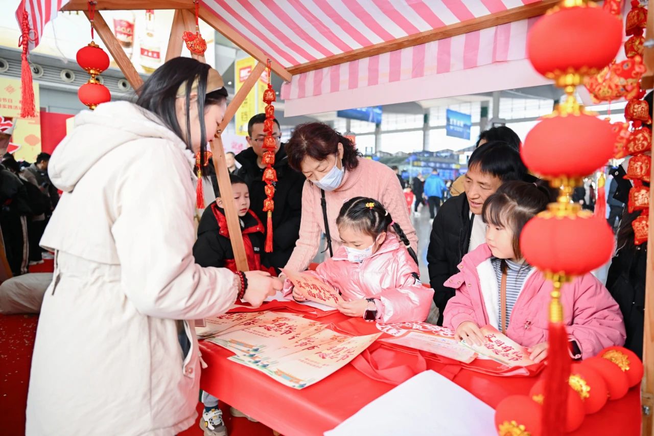 南阳火车站的玉都亲情服务台为即将踏上归途的旅客送去温馨祝福和精美春联,让候车室洋溢着浓浓的年味和温情。