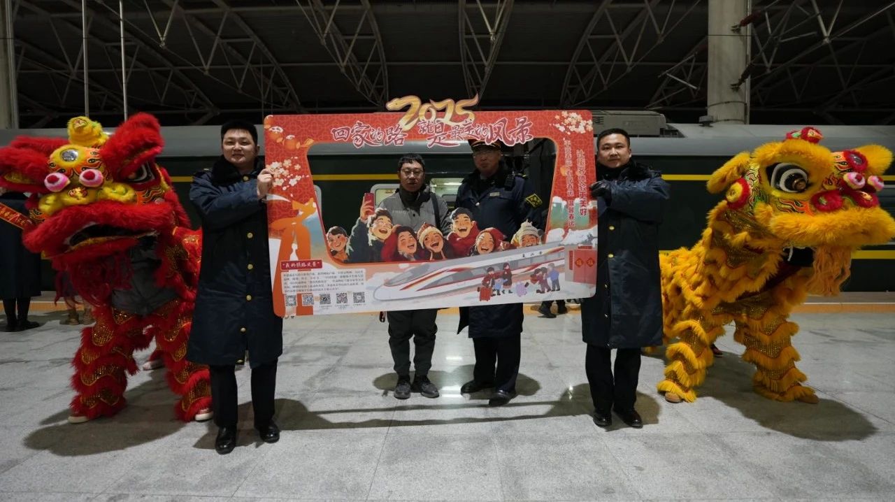 春运期间,南昌火车站“送福回家路 非遗迎新春”活动现场,旅客带着春联回家。