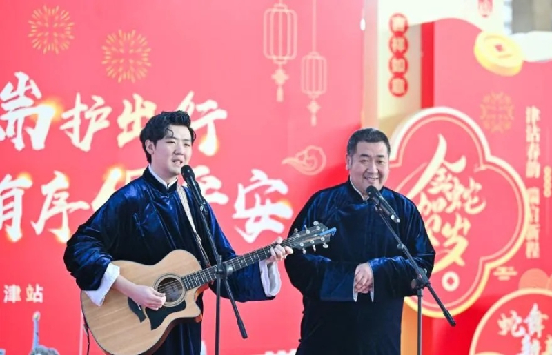 在天津站候车厅,文艺工作者为旅客表演相声。