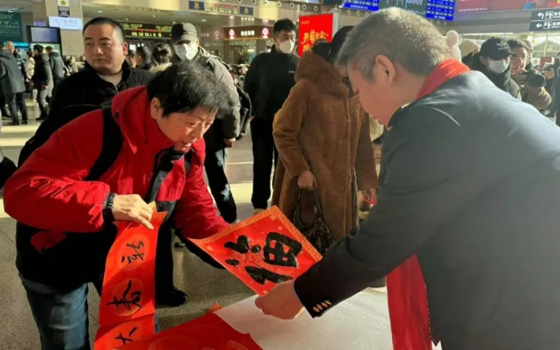 沈阳站开展公益活动,志愿者为旅客书写春联、“福”字。