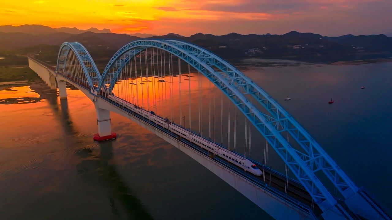 春运期间,宜万铁路长江大桥在霞光中傲然挺立,列车承载着旅客对家的期盼稳稳前行。