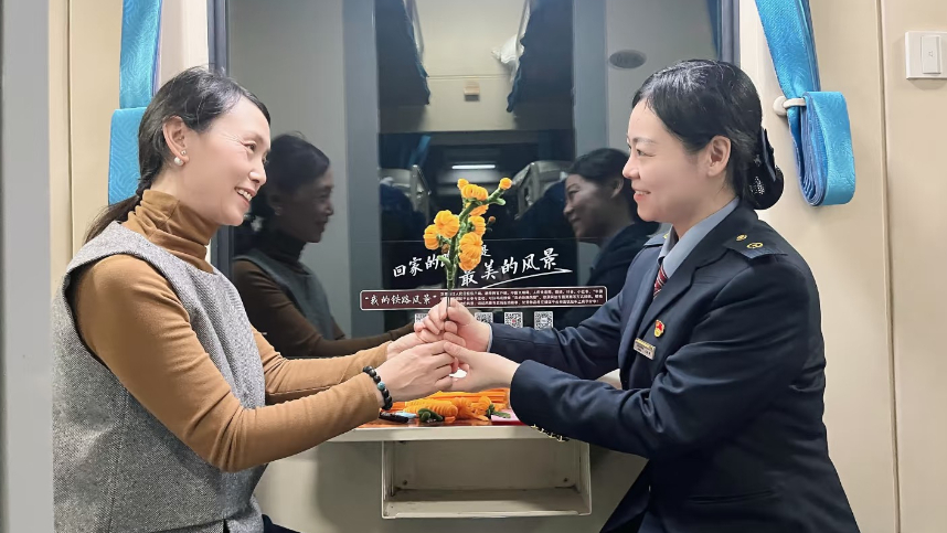 乘客把带着美好祝福的小手作送给列车乘务员。