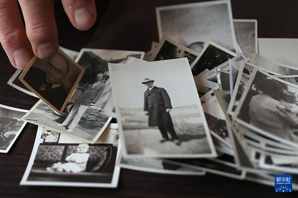 8月7日,在德国柏林,国际友人约翰·拉贝的曾外孙克里斯托夫·赖因哈特展示家族成员的老照片。新华社记者 杜哲宇 摄