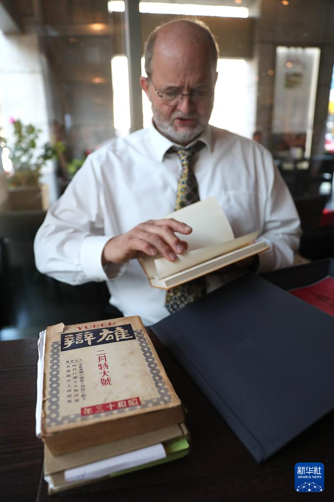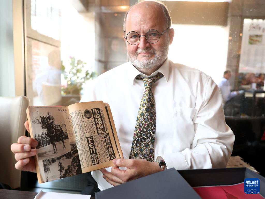8月7日,在德国柏林,国际友人约翰·拉贝的曾外孙克里斯托夫·赖因哈特展示自己收藏的南京大屠杀历史资料。新华社记者 杜哲宇 摄