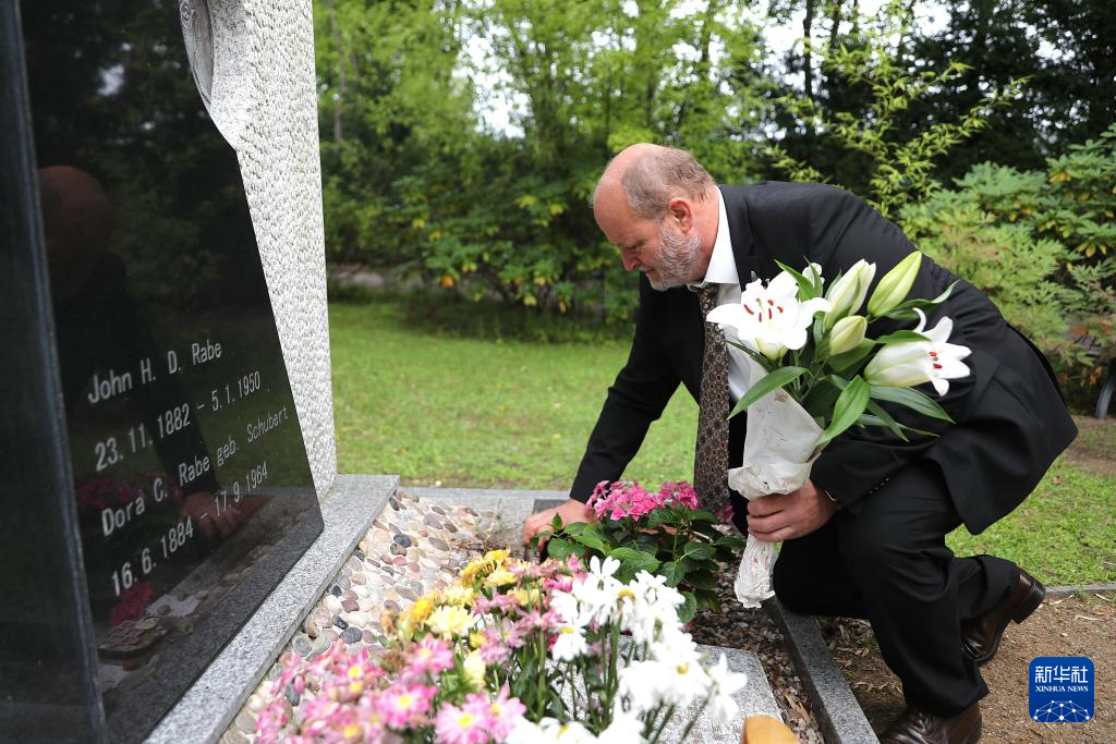 8月7日,国际友人约翰·拉贝的曾外孙克里斯托夫·赖因哈特在德国柏林的拉贝墓前悼念。新华社记者 杜哲宇 摄