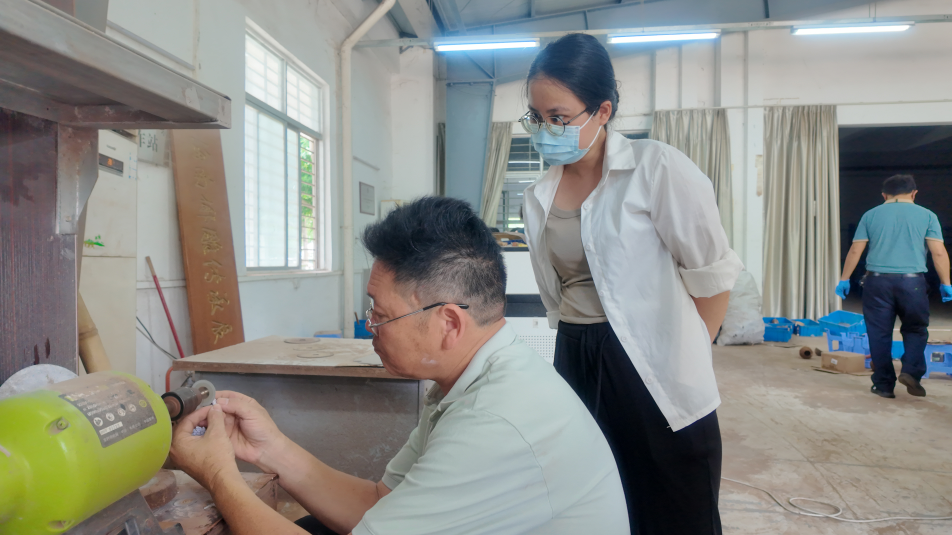 海口市级椰雕技艺代表性传承人朱凡(右)指导学员黄紫莛的椰雕作品。海南日报全媒体记者刘晓惠 摄