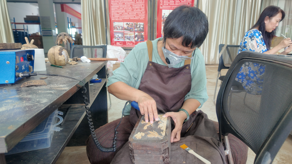 学员郑慧正在制作椰雕首饰盒。海南日报全媒体记者刘晓惠 摄
