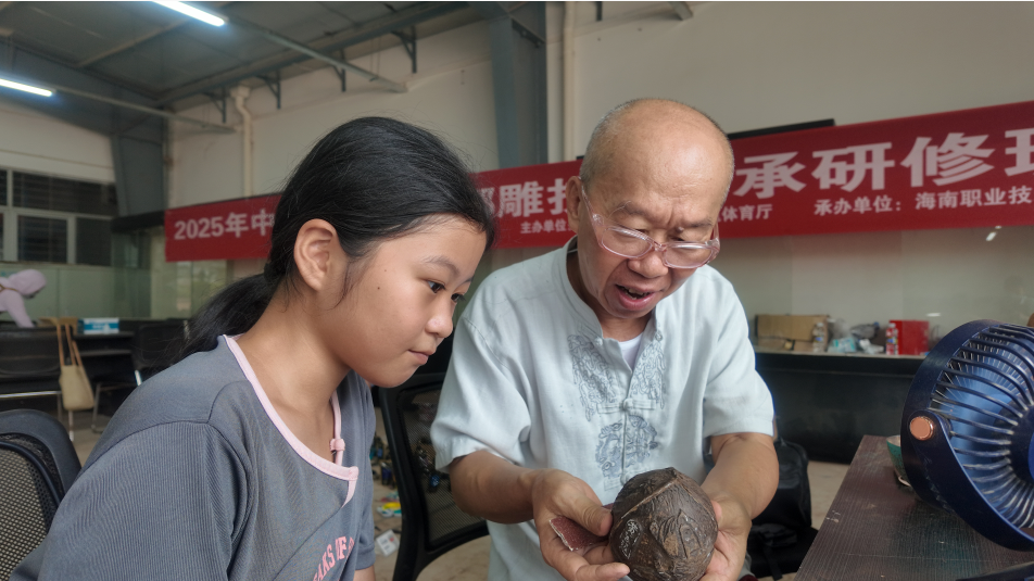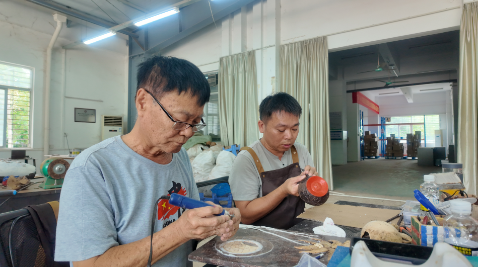 与椰雕结缘30余载,柯秋枫带出了众多学生。他欣慰地表示,如今的学生群体愈发多元,从小学生到大学生,从手工艺从业者到海南文化爱好者,越来越多人正被椰雕工艺的魅力所吸引。