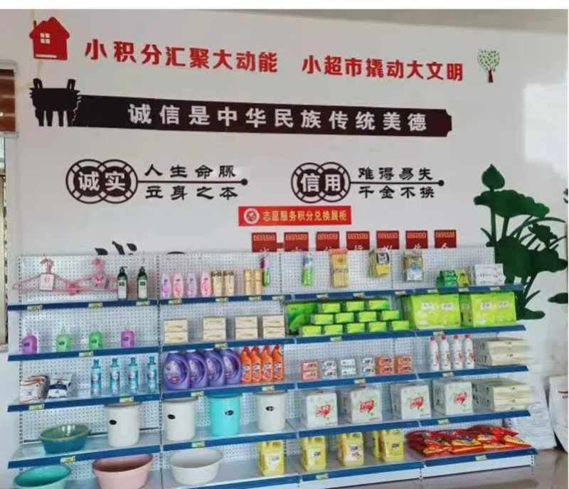 这样的“文明积分超市”在潜山已有32家。在天柱山镇白水村,货架上整齐摆放着食用油、洗洁精、烧水壶等生活必需品,村民可通过参与“婚事新办、丧事简办、孝老爱亲、志愿服务”等文明行为获得积分兑换。