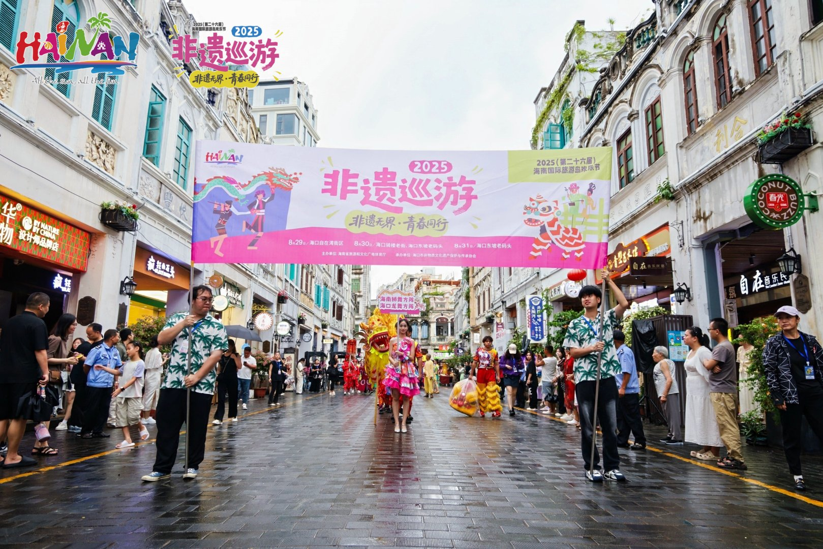 8月30日,市民和游客的观看热情高涨。巡游从海口骑楼老街水巷口出发,沿街巡游至得胜沙路段。巡游方阵集中展示了包括海南舞龙舞狮、麒麟舞、黎族面具舞、苗族招龙舞、儋州调声、黎族共同舞、竹木器乐演奏及打柴舞等八项海南代表性非遗项目,沿途观众掌声不断,气氛热烈。