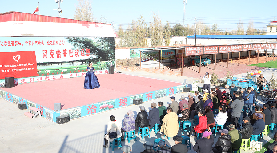 10月22日,阿勒泰市切尔克齐乡阿克恰普巴东村的文化广场上洋溢着火热的氛围。当天,“红石榴”文艺轻骑兵志愿服务队带着精心准备的节目,来到这里与当地舞蹈队联袂演出。悠扬的民族乐器声响起,队员们身着鲜艳的民族服饰,跳起了欢快的黑走马。一个个精彩的节目赢得观众阵阵掌声。演出接近尾声时,队员们走上前,邀请村民们一起跳起麦西来甫,欢快的节奏、灿烂的笑容、紧握的双手,将现场气氛推向高潮。