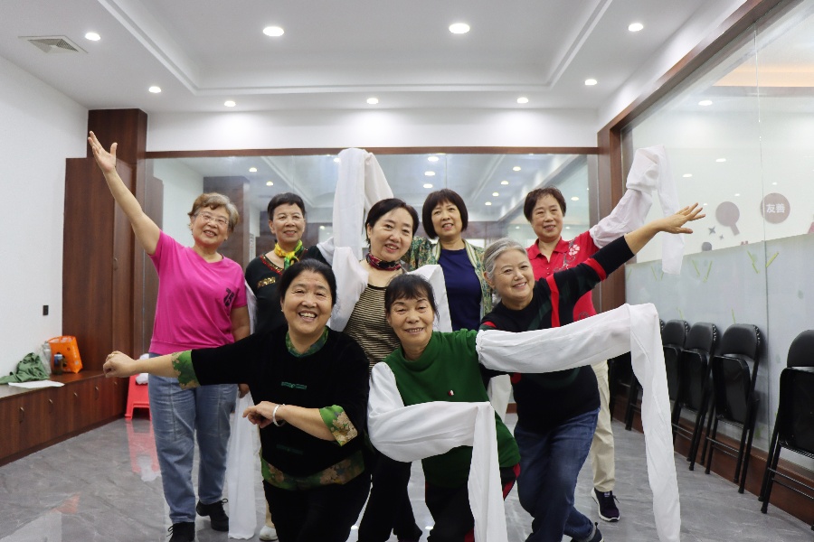 9月24日,南阳市人民公园艺术团舞蹈队正在卧龙区中兴社区新时代文明实践站内排练国庆节舞蹈。