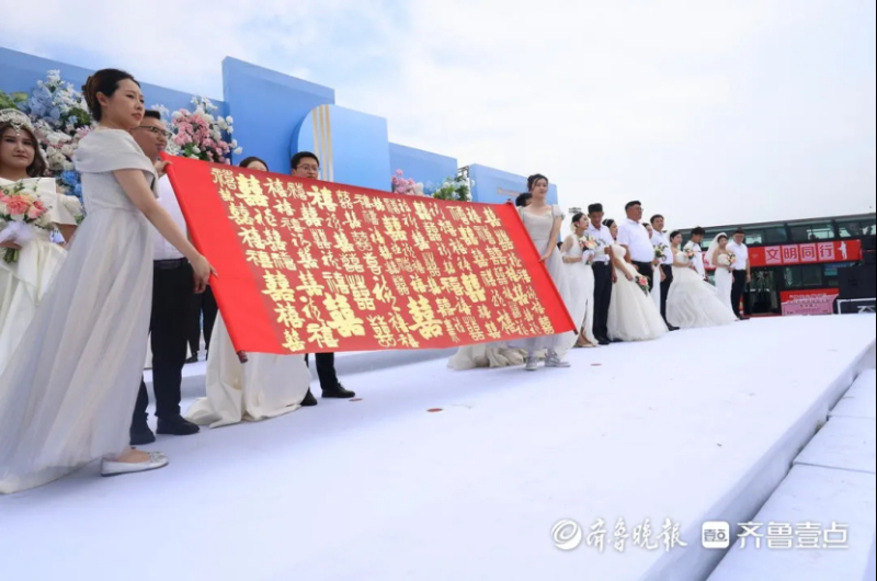 8月28日上午,“情定山海间”烟台市移风易俗主题集体婚礼举行。
