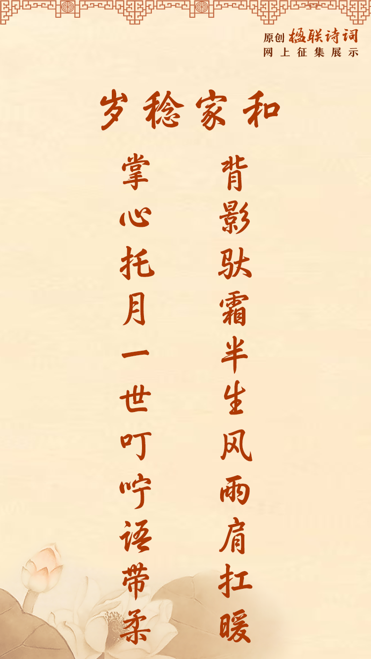 背影驮霜半生风雨肩扛暖 掌心托月一世叮咛语带柔 | 楹联