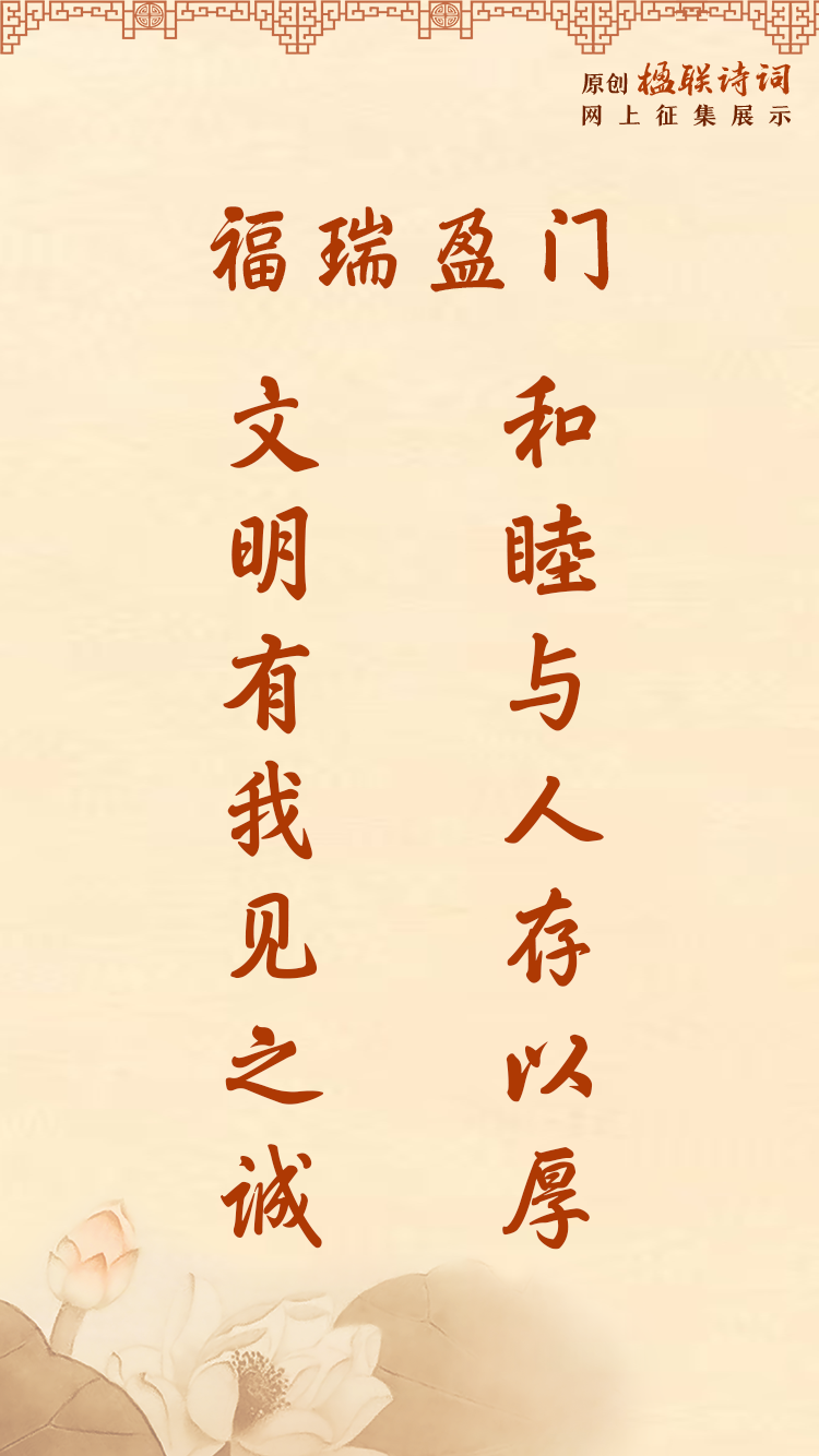 以诗会友,以联传情!中国精神文明网和中国楹联学会共同策划开展原创楹联诗词网上征集展示活动,让我们共赏楹联诗词,弘扬中华民族传统美德,共建家庭文明良好风尚。