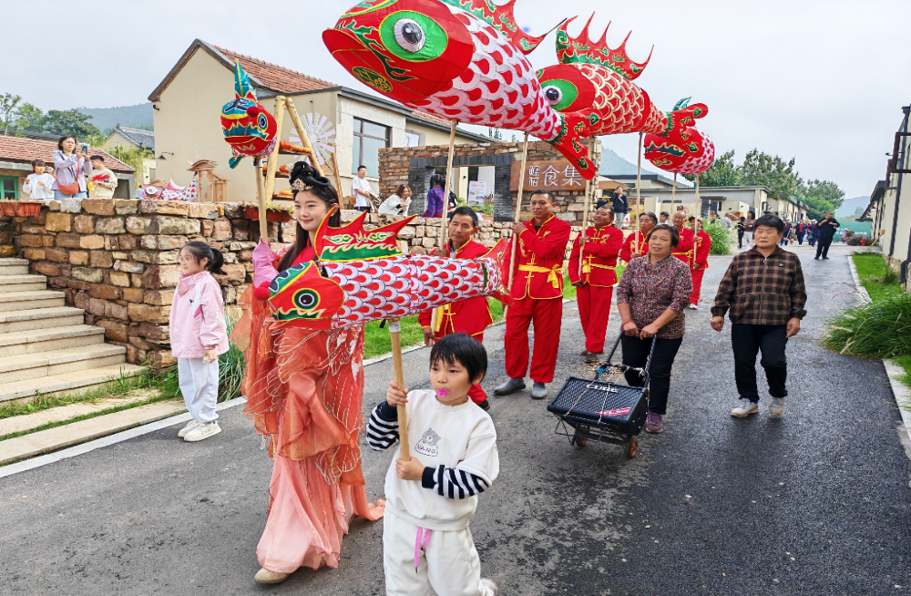 在山东省济南市长清区马山镇双泉庄村,村民们举着象征元宵节“鱼跃龙门”的巨型红鳞鱼灯在村内游行,节日氛围扑面而来。