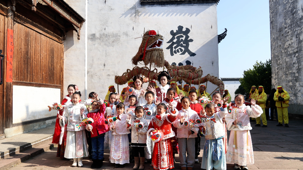 安徽省黄山市徽州区潜口镇潜口村在潜口民宅开展舞草龙、舞鱼灯活动,欢欢喜喜庆祝元宵佳节。