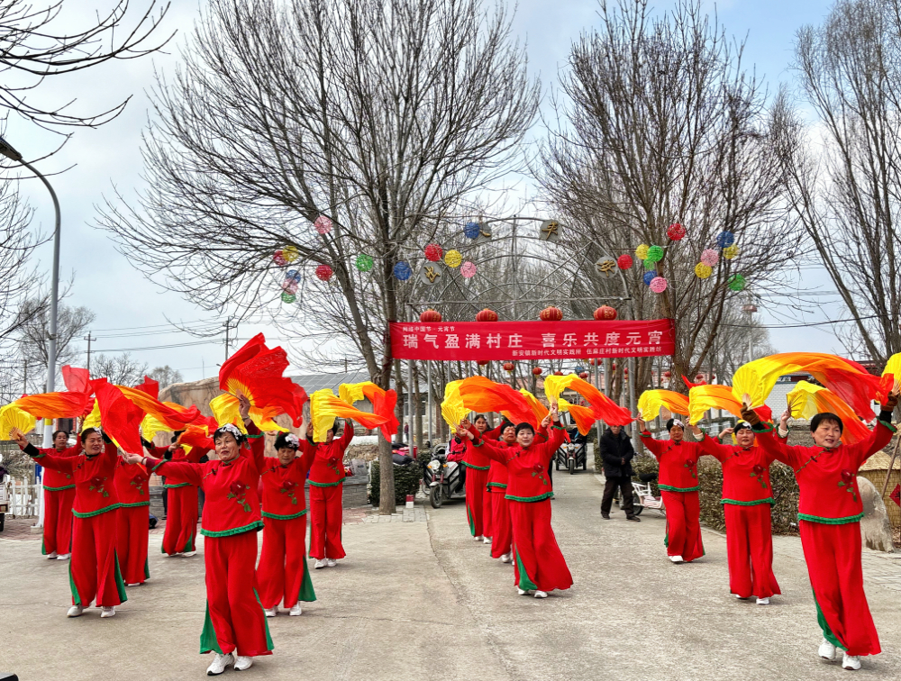 在天津市宝坻区新安镇伍麻庄村文化广场上,第二届“瑞气盈满村庄 喜乐共度元宵”主题活动热闹非凡。身着节日盛装、手持彩扇的村民们,踏着欢快的鼓点翩翩起舞,喜气融融闹元宵。