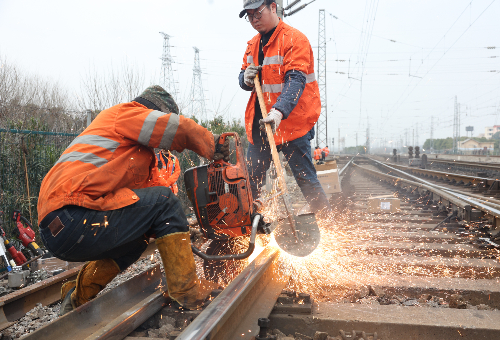 在向塘西站,南昌工务段职工正在进行锯轨作业。中国文明网网友@沈文吉 摄