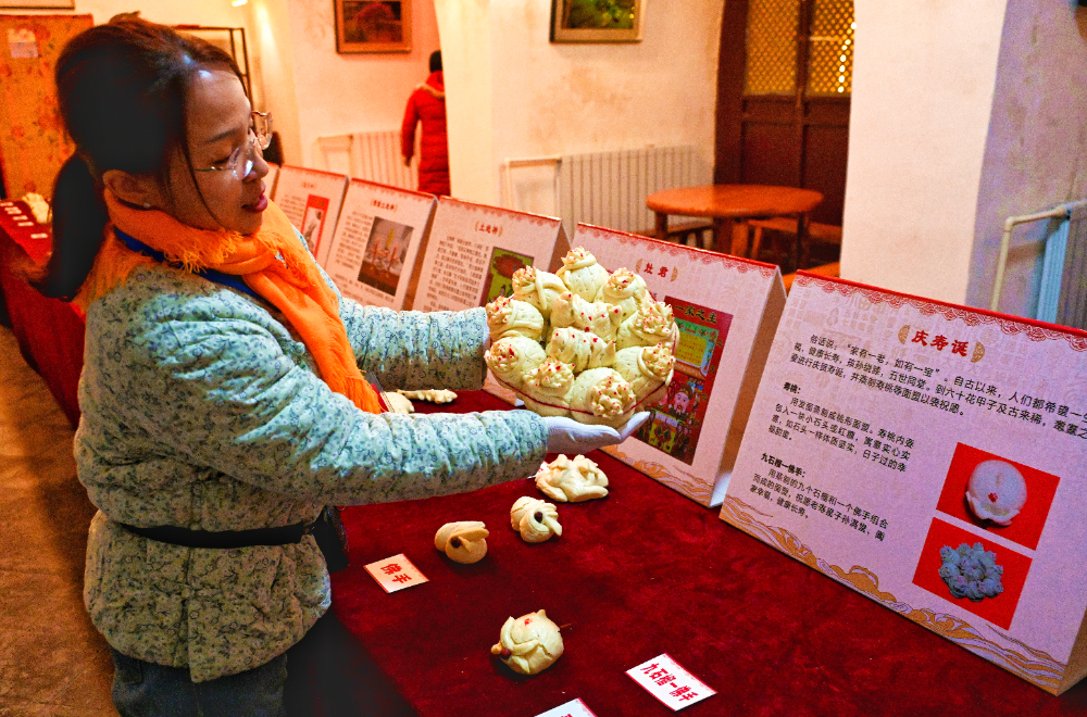 游客展示非遗花馍。