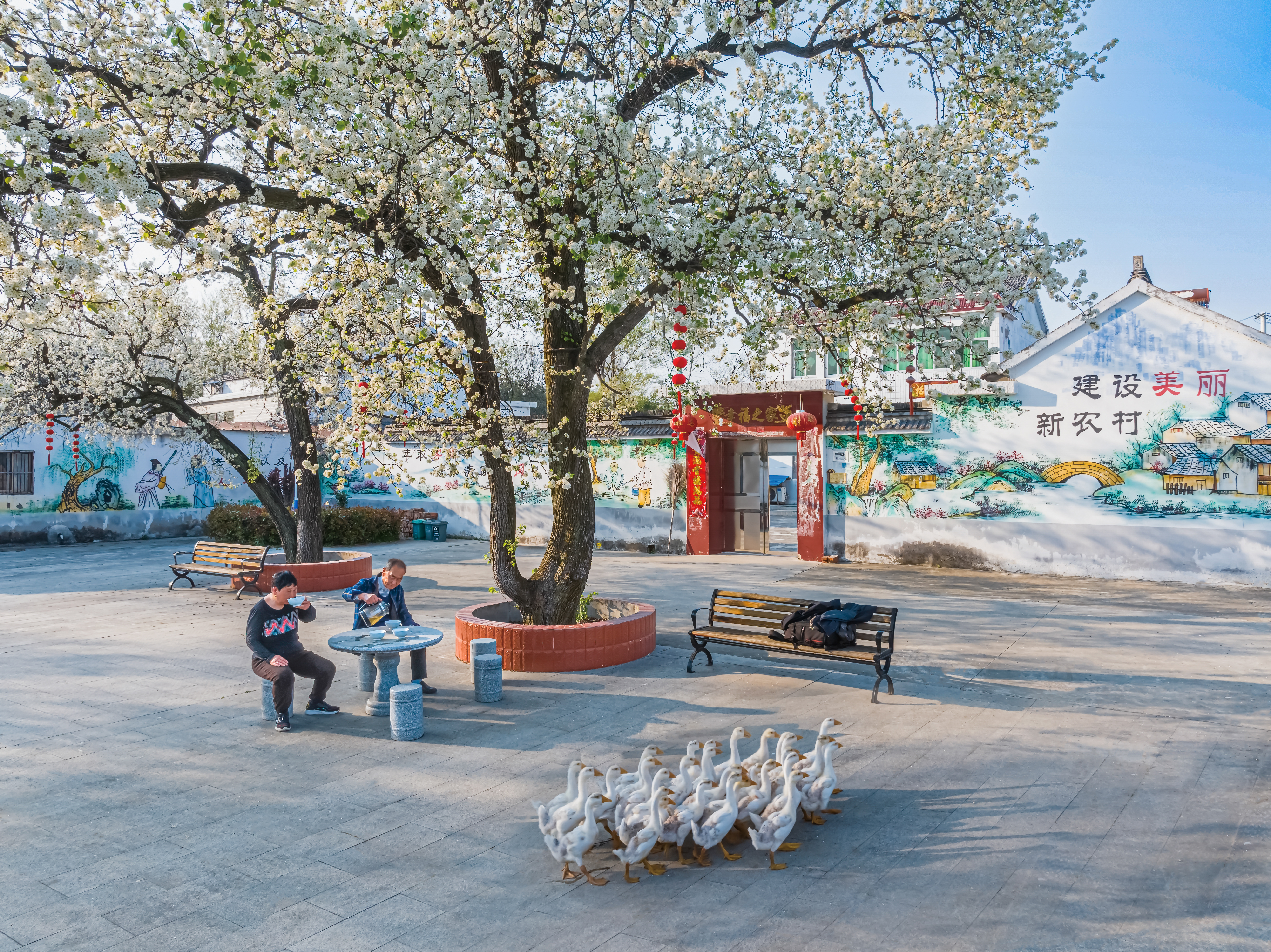 在江苏省南京市六合区冶山街道双墩村,棠梨花开胜雪,村民清茶闲坐,放眼望去满是安居乐业的舒心与祥和。