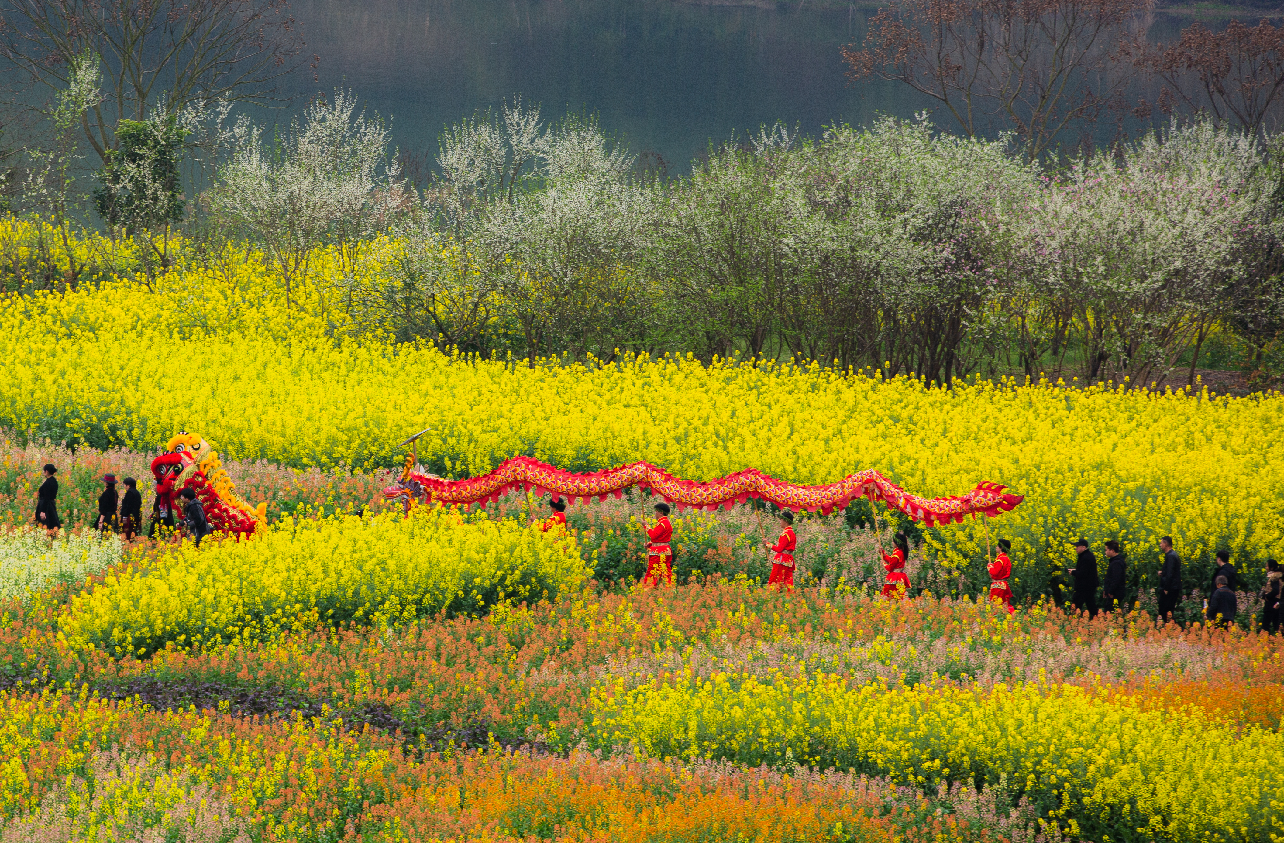 在四川省自贡市富顺县狮市镇花园村,金黄的油菜花田铺就金色长卷,踏春舞狮的队伍穿行其间,绘就了一幅生机盎然、热闹鲜活的春日乡野盛景。