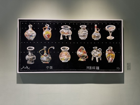 阿曼艺术家尤素夫·阿里将唐代诗人王之涣的名句“黄河远上白云间,一片孤城万仞山”写在以骆驼为主题的油画作品上,以表现千年丝路连接着两地从古至今的友好往来;阿塞拜疆艺术家阿纳尔则将良渚陶器与阿塞拜疆陶器放进同一幅作品中,以展示不同文明在文化创造上的相通之处……