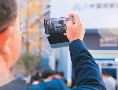 2023中国视听创新大会的主会场外,观众用手机摄影留念。主办方供图