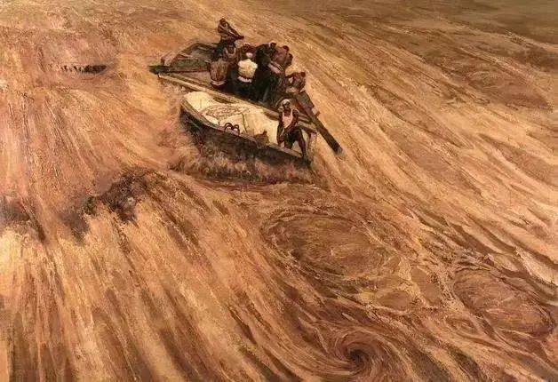 在画作中,杜键对船工们的形象没有过多着墨,汹涌奔腾的黄河水才是画面的视觉核心。他选择描绘渡船在过激流险滩时最惊心动魄的一刻,船工们齐心协力与激流搏斗。这里,黄河寓意着艰难险阻,是被征服的。所以,这幅作品赞美的是象征着中华民族的船工们的艰苦奋斗的精神。杜键以一种表现主义的视觉语言风格进行创作,是超越时代的。他用朴拙厚重的大笔触表现湍急的黄河水,反衬了黄河船工们的英雄气概。这与王式廓、罗工柳和董希文先生的启发和影响分不开,罗工柳先生当时就主张要大胆尝试把中国传统写意画和书法理论中的神韵渗透到油画创作中来。(供稿:中国美术馆 作者:魏祥奇)
