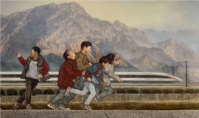 画家以独特的视角和写实的风格,描绘了高铁开进大山的生动画面。一列白色高铁在延绵的群山脚下疾驰,近处几个七八岁的孩子欢欣雀跃,推着铁环嬉戏玩耍,身形颇具动感,仿佛在与高铁赛跑。奔驰的高铁与滚动的铁环相映生辉。整幅画作气势恢宏,用笔细腻,人物形象生动活泼。作品让人们强烈感受到穿梭在崇山峻岭之间的高铁,使“天涯”变为“咫尺”,架起了古老山村与现代都市的天堑通途,增进了山村孩子与多彩世界的交流联系,带来了乡村振兴的美好希望。(供稿:中国美术馆 作者:付瀛莹)