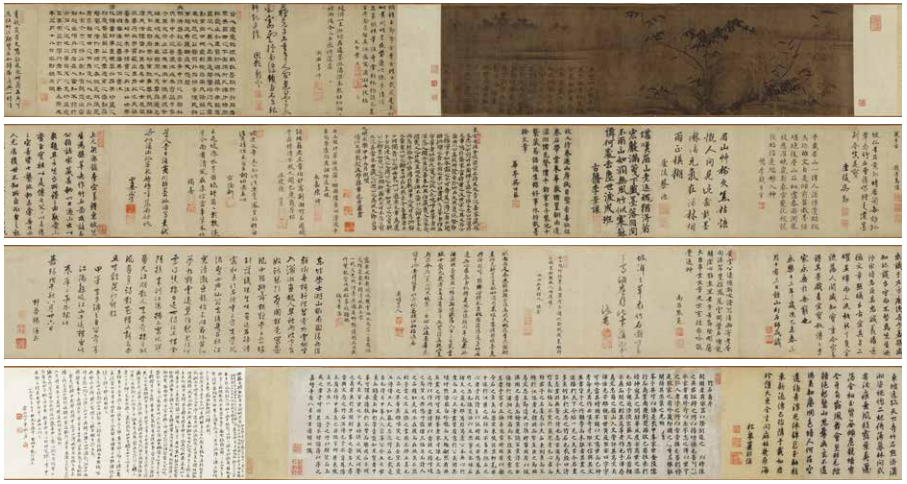 《潇湘竹石图卷》是中国美术馆的重要藏品。说它珍贵,一是年份早,作品创作至今已有900多年。二是极其稀有,苏轼传世至今的绘画作品仅有两三件。三是传承有序,此画后面有近30位鉴藏家的题跋,记录了此画的传承过程。画作名叫《潇湘竹石图》,其实,其本名叫《竹石图》,《竹石图》前面冠以“潇湘”,指的是朦胧的意境。绘画的落款“轼为莘老作”,苏轼与两位叫作“莘老”的人关系密切,一个姓孙,一个姓刘,此“莘老”指的是孙莘老,也就是孙觉。“轼为莘老作”单列落款,与元人双列平头款有很大区别,符合宋代落款习惯。这幅画的绘画风格与历史上记载苏轼绘画的风格基本吻合,尤其反映出苏轼画竹“不分节”“不求形似”“逸笔草草”的特点。苏轼倡导文人画,强调诗画一律,以书入画,追求得意忘形、天工清新,这幅绘画所呈现的意境与苏轼所倡导的文人画思想高度吻合。更耐人品味的是长长的题跋,可以让人穿越历史,去感悟宋、元、明、清文人的翰墨情怀与丹青雅致。(供稿:中国美术馆 作者:薛帅杰)