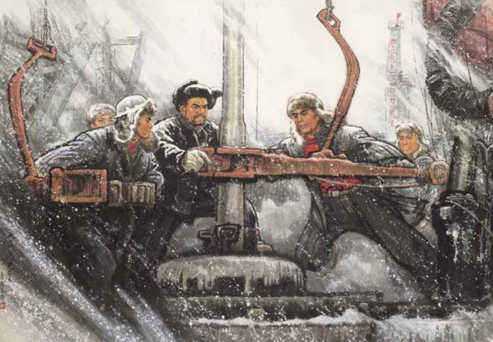 这是一件文艺工作者扎根社会生活、反映时代精神风貌的经典作品。画面中大雪纷飞,以铁人王进喜为代表的英雄们不顾零下30多摄氏度的严寒,顶风冒雪,抱着坚定的信念和火热的激情与恶劣的天气进行顽强斗争。画面中,左边铁人王进喜固定住钻井台,站位略高,以突出其为主要人物;右边的工人展开双臂,用力旋转操作钻井机器;旁边的工友则全神贯注地盯着中间正在工作的人物。画面采用横向式构图,高耸的标语、设备、钻井和忙碌的工人错落有致,富有秩序感。画家用质朴的艺术语言,使笔墨服从于人物形象的刻画,人物形象服从于主题表现,反映了一种彰显中国气派、弘扬中国精神并与大众审美趣味相契合的创作模式,成为“笔墨当随时代”这一永恒美学命题的生动注解。(供稿:中国美术馆 作者:沈军)