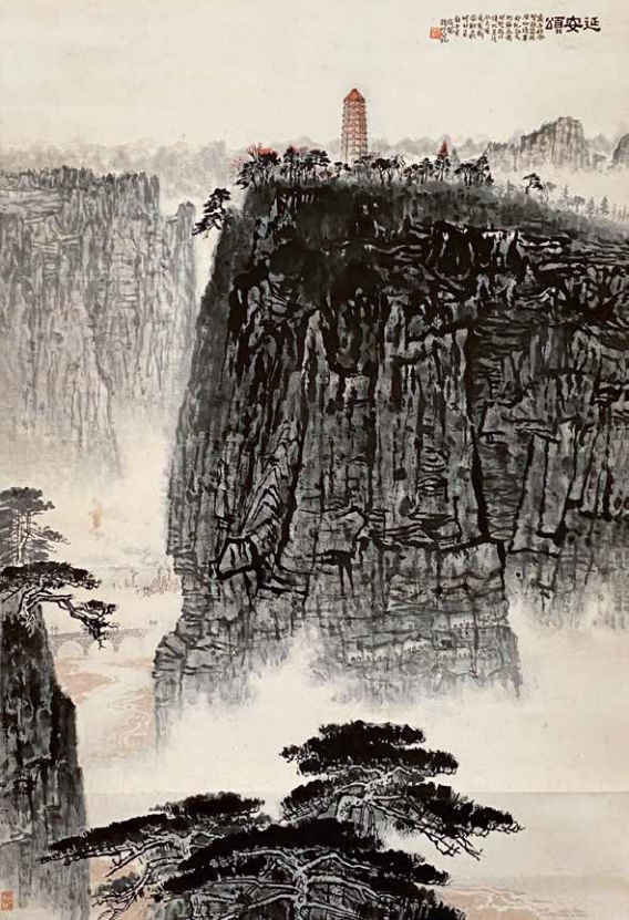 延安是新中国革命圣地画的一个重要母题,它是地理上的延安,也是人们心中的延安,是被寄予崇高想象和精神价值的圣地。此幅《延安颂》作于1962年,是钱松嵒(yán)延安母题系列画作中较早的作品。作品以竖幅立轴形式表现,从延河下游视角对望宝塔山,迎面主峰雄峙,宝塔巍然立于主峰之巅,塔山永峙,延水长流。画面左侧下方依稀可见延河大桥,深沟里厂房林立,体现出圣地新貌。近景几棵松树郁郁葱葱,寓意江山永年。整幅作品用笔遒劲重拙,体现出书法用笔的沉涩古朴之美,墨色凝重浑厚,苍润华滋。山体浓墨勾皴加以点染,又有轻描淡写的小树围绕宝塔,使宝塔与山的气势更为雄伟。宝塔、天空及近处延河略施曙红、赭石色,如曙光初照,给画面增加了无限生机,也寓意着延安精神永放光芒。