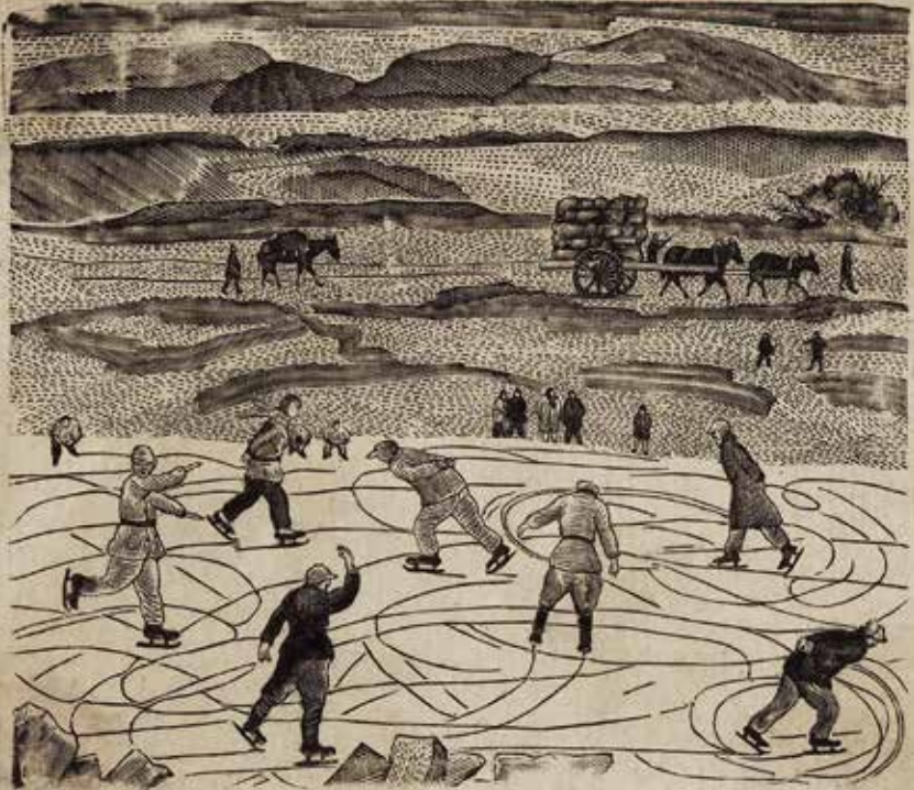 画面分为上、下两部分,上半部分以“密刀”手法表现了延河岸边的远山、驮马、行人,线条转折柔和,色度变化细腻,形成温和的灰调子,尽显木口木刻技法的独特魅力,准确表现出革命圣地清晨时分的静谧安详。画面的下半部分是入冬后的延河冰面,着装不同、姿势各异、动态呼应的溜冰者就像一个个欢快跳跃的乐符,与金光闪闪的冰面形成强烈对比,紧紧吸引住观众视线,形成作品的兴趣中心。