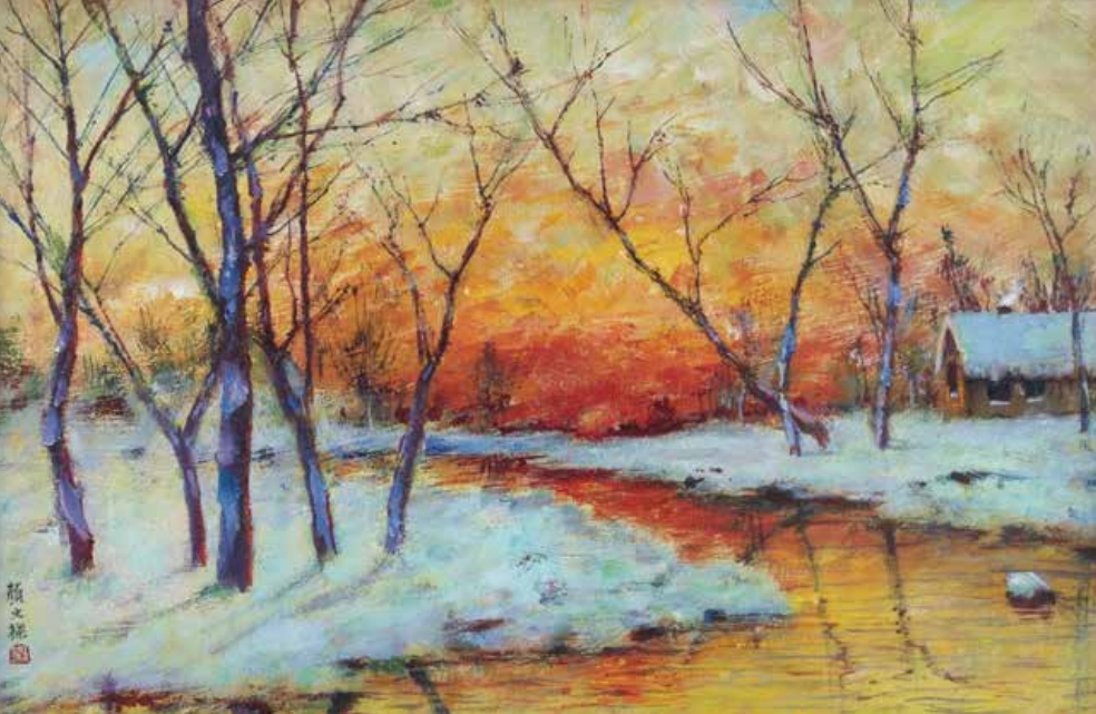 《晚霞雪景》创作于20世纪70年代,是颜文樑先生的暮年之作。作品近景中姿态婀娜、疏密有致的树与影远近错落、俯仰顾盼,在灵动的笔触中凸显出画家扎实的造型功力;曲折的河道将我们的视线引向远方的天际线,漫天的霞光晕染了河面,使整幅画面笼罩在一片橙红色的暖色调中,蓝紫色的雪中微微泛出暖黄色的霞光。画家运用粗放、洒脱的笔触表现物象色彩的微妙变化,画面在冷暖色的对比与交融中呈现出美妙的色彩律动。欣赏这幅作品,我们可以感受到画家秉承了印象主义对光色变化的娴熟把握,同时,夕阳、冬雪、枯树、小河、房舍、炊烟所营造的画境也让我们看到了画家所追求的诗情和东方美学的意境。(供稿:中国美术馆 作者:庞桂馨)
