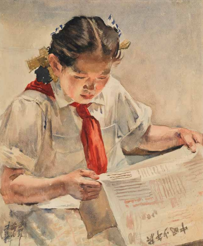 李斛的《读报》为一幅人物画小品。作者以写实兼写意的笔法和浅淡的色彩表现一位少先队员坐在某处,双手捧着《中国少年报》,微微颔首阅读的瞬间情形。她头梳短辫,青丝以概括的浓色绘出,头发的高光和额头的暗部形成反差,黝黑的短发与鲜艳的红领巾构成鲜明的色彩对比。少先队员全神贯注,洋溢出幸福的表情;由于她的眼睛正在向下看报,所以李斛用两条短小的弧线刻画双目,这种“点到为止”的手法反而使人物的神情更加专注沉醉、生动传神。人物的衣服以浅绛之色写出,散淡雅致,变化微妙;手臂被刻画得较为细致突出,以红色调渲染出充满青春的蓬勃朝气;报纸则以折线的方式勾勒出正负空间,其上的文字由于无关紧要,所以除了“中国少年报”五字之外,均以纵线和横线加以概括。