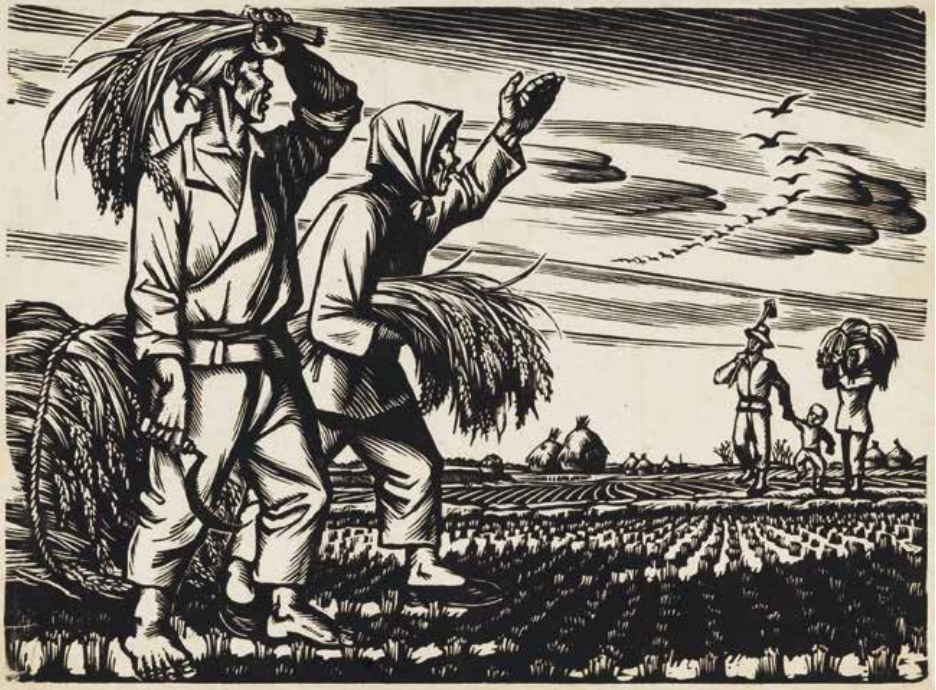 《秋收》这幅作品体现了“木刻运动要大众化,艺术队伍要深入农村,到实践中去”的主张。画面表现了南方农民一家三代人在田间劳作收割稻谷的场景,画中的老农脸上洋溢着自信与满足的笑容,他的右手握着镰刀,举起的左手紧紧攥着刚刚收割的稻谷,正擦拭着额头的汗水。农妇怀抱稻谷正在召唤远处的儿子、儿媳、孙儿。人物身边成捆的稻谷和远处的谷仓,突出了土地的广阔与肥沃,表现出作者对生活的热爱。作品以刀代笔,画面充满了感人的生活气息。灵活的刀法运用将黑、白、灰的关系组织得恰到好处,观者能感受到刻刀在木板上走笔,流畅与钝涩相谐的线条细腻而明净。尽管这件作品创作于抗日战争期间,但作者从讴歌生活的角度表现了中华民族的坚韧与顽强。(供稿:中国美术馆 作者:安雪)