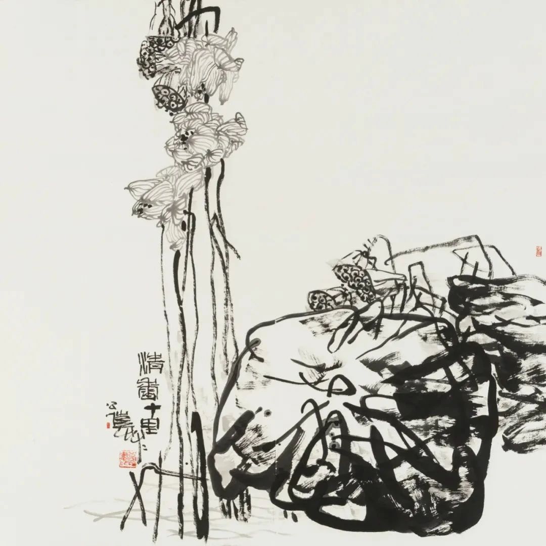 这件《清香十里》由潘公凯先生作于2018年。潘先生的水墨荷花作品格调高雅、意境深远,有着传统文人画笔墨书写的洒脱、流畅、率真、精妙,同时其独特的艺术风格兼有当代审美情趣。潘先生近年的作品更注重中国画抒情写意的根本特质,以笔墨为宗游目骋怀,很少设色,擅在墨中求变,笔法有楷篆之意。这幅作品中右下角的荷叶笔墨深沉、苍劲有力,画面左侧三分之一处,七八枝枯意花梗从淡雅的水中生出,几支浓淡相宜的荷花、莲蓬随着清风轻轻摇曳,阵阵清香沁人心脾。整幅作品墨色、布白、动静、虚实、节奏、气韵相结合,观者能感受到画家所追求的中国画特有的神韵和意境。薛永年先生评价:“潘公凯的绘画是理论自觉后的实践,是以精英传统吸收时代新机的探索,是体现了传统精神与现代审美结合的学者画诉求。”(供稿:中国美术馆 作者:闫珉)