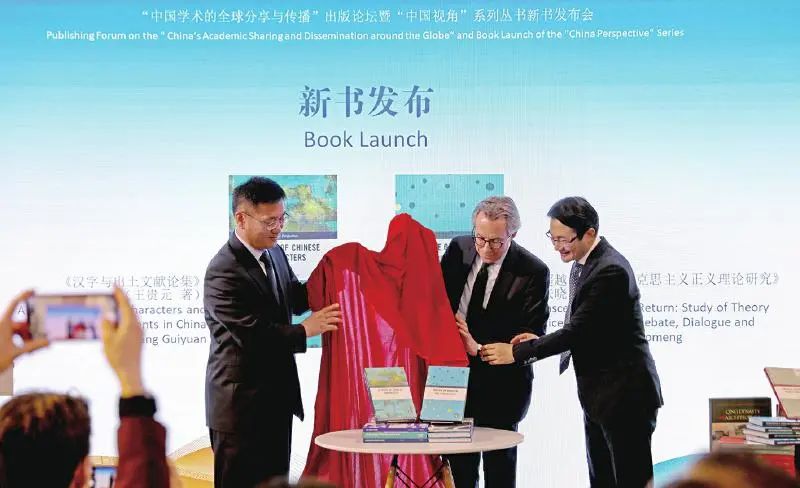 嘉宾在“中国学术的全球分享与传播”出版论坛暨“中国视角”系列丛书新书发布会上为新书揭幕。新华社记者 李颖 摄