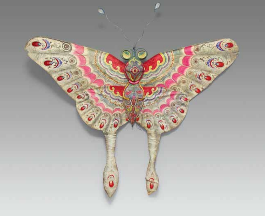 “风筝哈”的软翅风筝较之其他风筝流派的最大不同之处是其翅膀向上、向外翘起,膀尖骨架弯曲部分弧度加大,这样的设计可以加大风筝翅膀的受风面,使其在放飞时不会因为风力过大而导致翅膀下垂,增强了软翅风筝抵抗强风的能力,从而提高放飞性能。哈氏风筝另一特点是色彩丰富,画工精致。这件作品采用对称构图,蝴蝶翅膀由多层连续图案组成,勾勒细腻,细节处运用了哈氏风筝所特有的、也是最具代表性的绘画技法“秃笔丝毛”,即用修剪成秃笔状的笔尖擦绘出鸟类羽毛或动物茸毛,使之呈现出栩栩如生的写实效果。(供稿:中国美术馆 作者:刘莹)