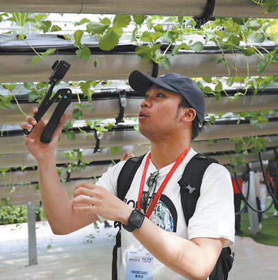 闻名在河南商丘市夏邑县太平镇参观龙港湾空中草莓体验馆的智慧农业设施并录制视频。受访者供图