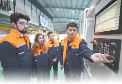 沈阳工学院与武汉华中数控股份有限公司共同建设“一带一路”订单班,联合培养行业急需的“专业+俄语”高素质应用型人才,订单班学生毕业后将回国从事数控技术相关工作,实现高质量就业。图为中国同学和留学生分享操作经验。新华社记者 杨青摄