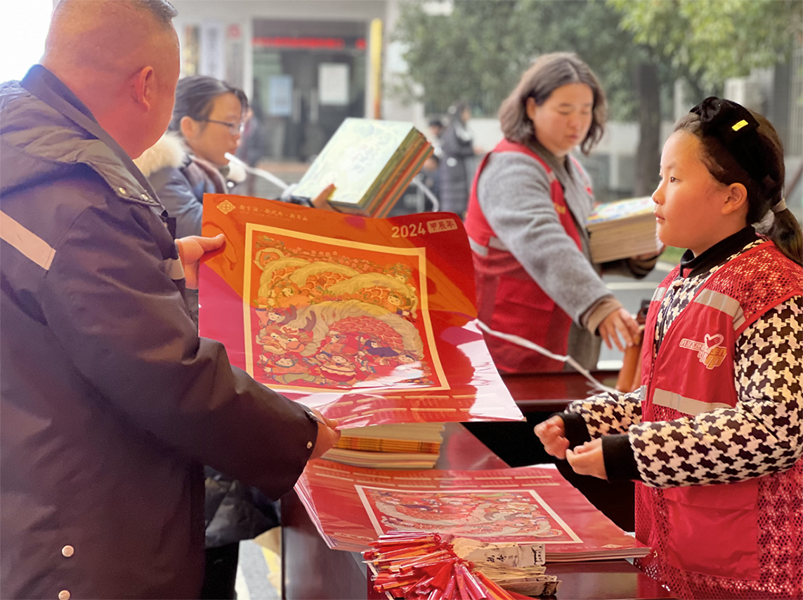 1月30日,湘潭市湘潭县2024年文化科技卫生“三下乡”暨“莲乡里手”文明实践集中示范活动现场,来自湘潭县文明办招募的小志愿者为乡镇留守儿童送上精美的年画和书签。