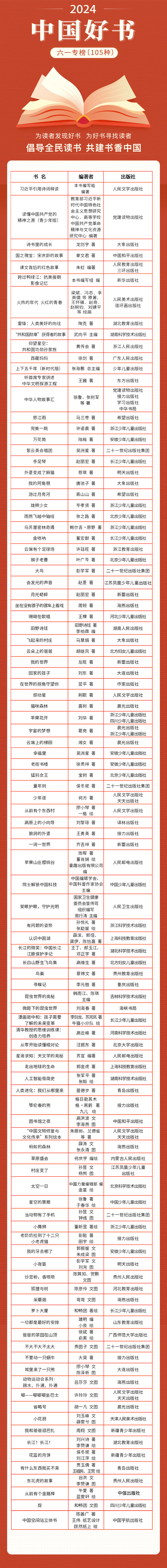 在中宣部出版局指导下,经中国图书评论学会组织评选,2024年“中国好书”六一专榜近日在京发布,共有105种图书入选。